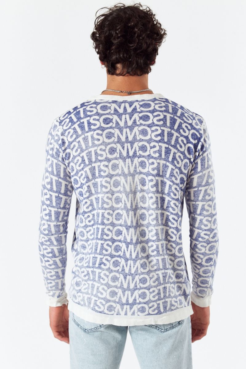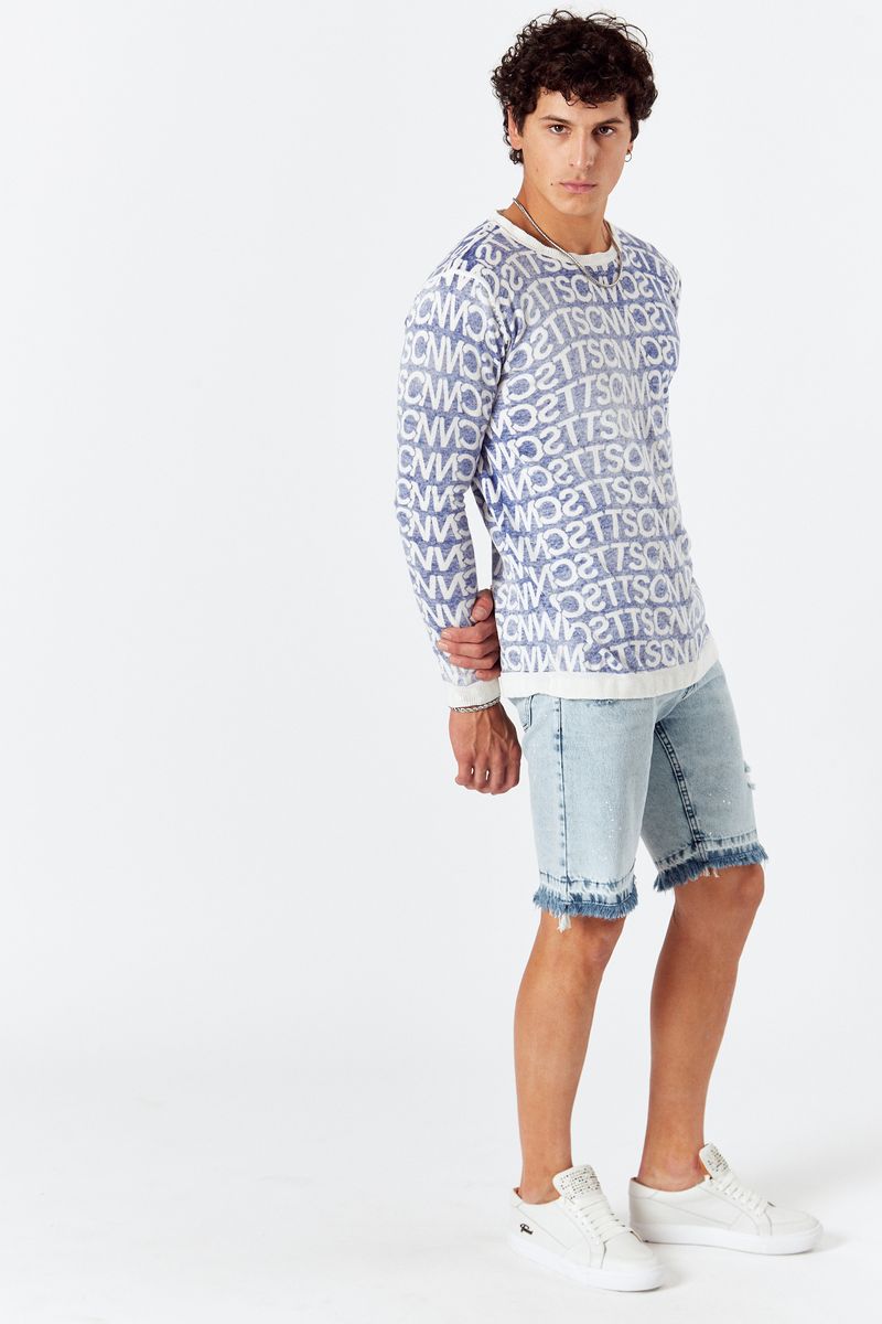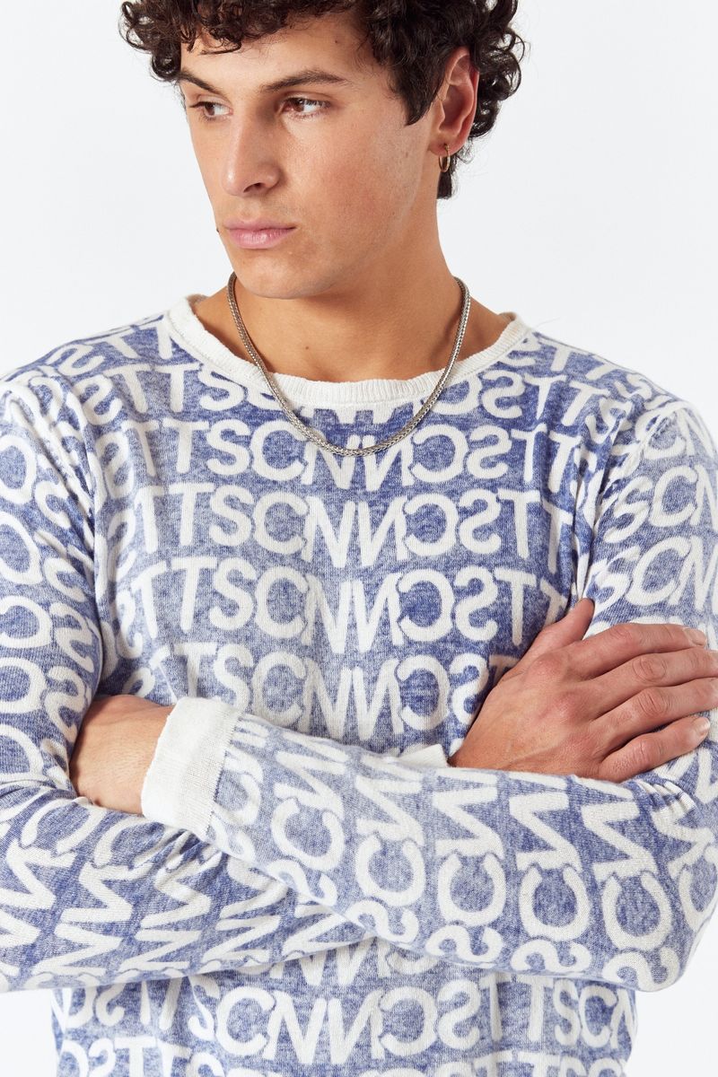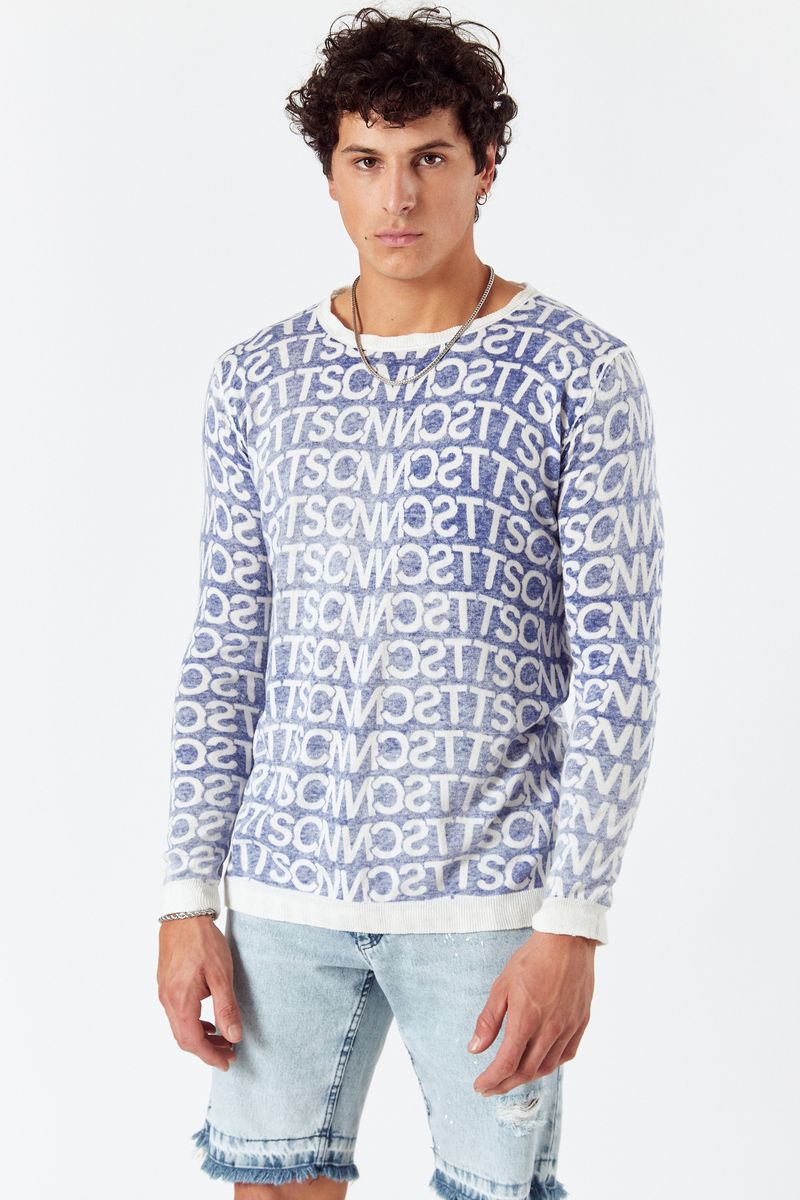 Sweater de tejido liviano, calce clásico y escote redondo. Cuerpo estampado con repetición de logo en color a contratono de la base. Tira de escote, puños de mangas y puño de cuerpo con tejido tipo ribb en color blanco. 100% algodón Lavar del lado del reves