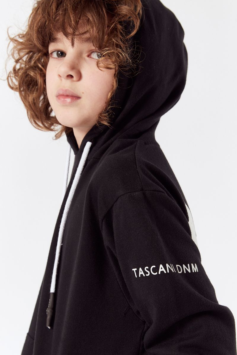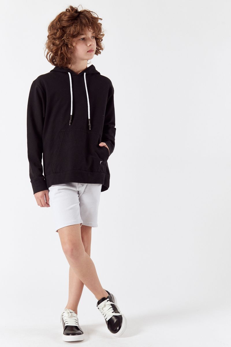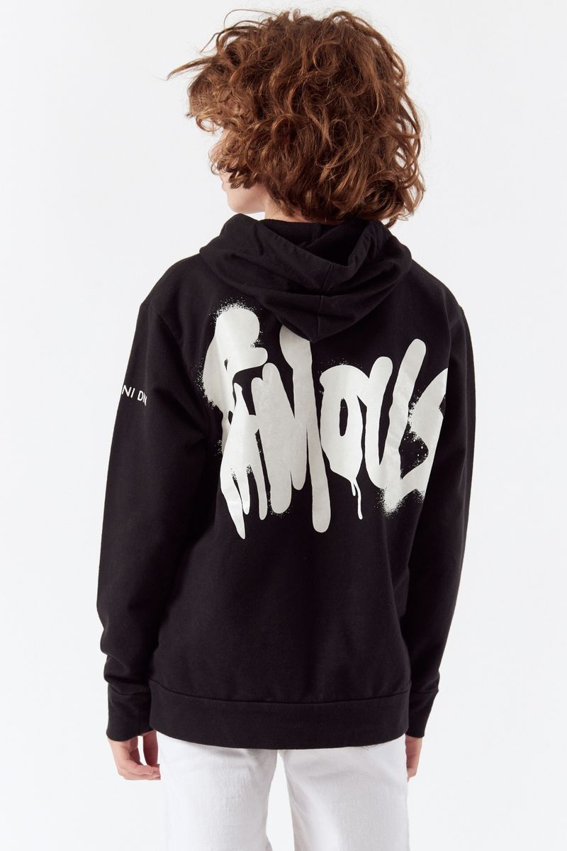 Buzo canguro rustico con lycra, bolsillo en el frente con goma rectangular institucional en sector inferior derecho. Cordón blanco chato con punteras personalizadas negras. Posee estampa grande en espalda. 95% algodón 5% elastano