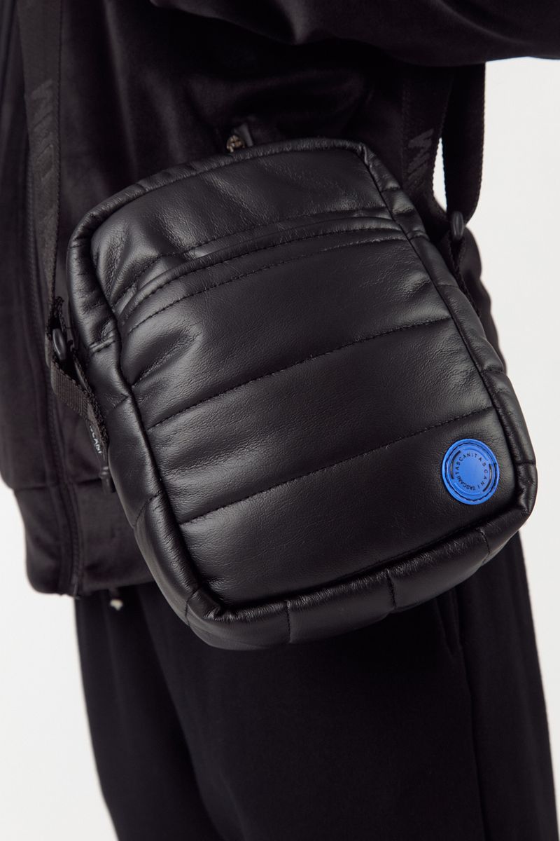 Bandolera de cuerina matelaseada con bolsillo en el exterior. Cuenta con correa institucional de 30mm regulable, chapon circular metálico color negro y forreria institucional.