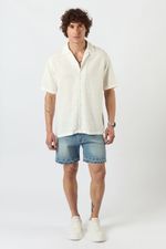 Bermuda de jean de piernas recta y calce cómodo, bajada de color a celeste con acid wash, manteniendo un azul en laterales. Bolsillo trasero derecho y badana marcado solo por contorno del faltante de pieza y reserva de color mas intensa, en esta ubicación Tascani bordado.
