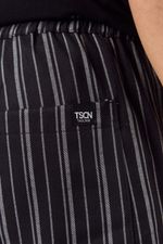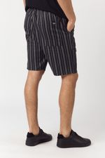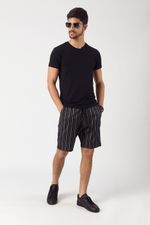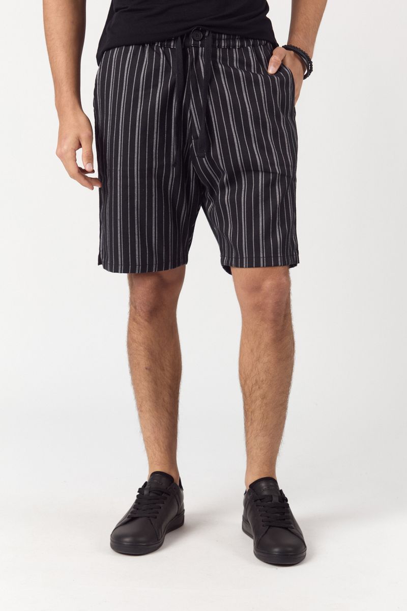 Bermuda de tela importada negro con rayas blancas . Cintura con elástico y cordones. Tiene avíos personalizados con logo de la marca.