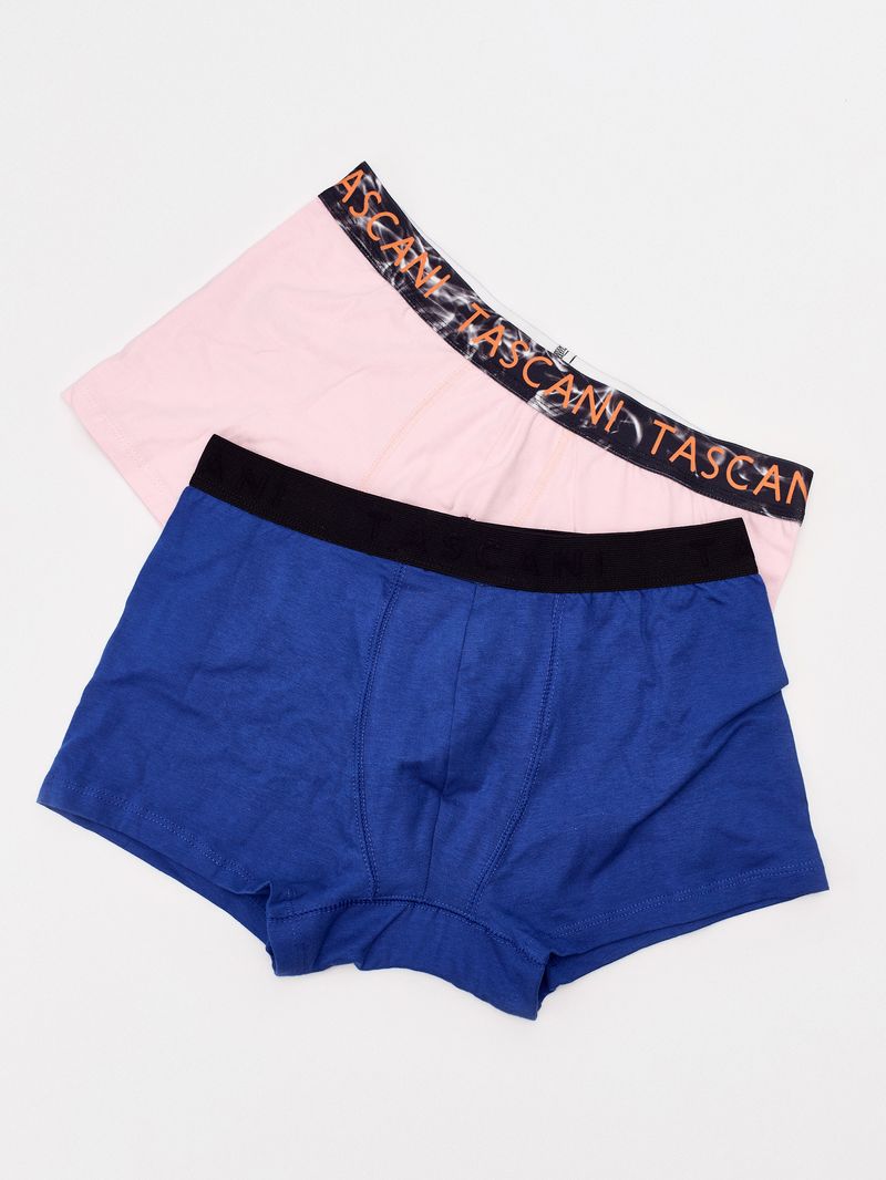 Bóxer pack X2 slim fit liso combinado. Uno azul con elástico negro tejido personalizado, otro rosa con elástico estampado Tascani naranja. Composición: 96% algodón 4% elastano
