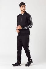 Buzo tipo camperita deportiva de calce slim fit, en color negro. Confeccionado con cuello, puños y cintura en tejido de poliéster al tono. Acceso frontal mediante cierre termofusionable también al tono. Detalle de comunicación de marca a través de elástico sublimado en blanco y negro con el logo Tascani, aplicado sobre los laterales de las mangas.