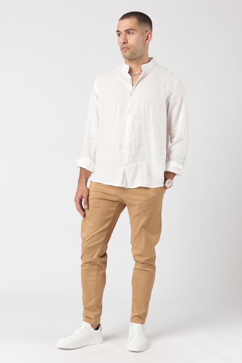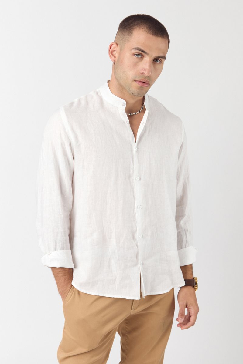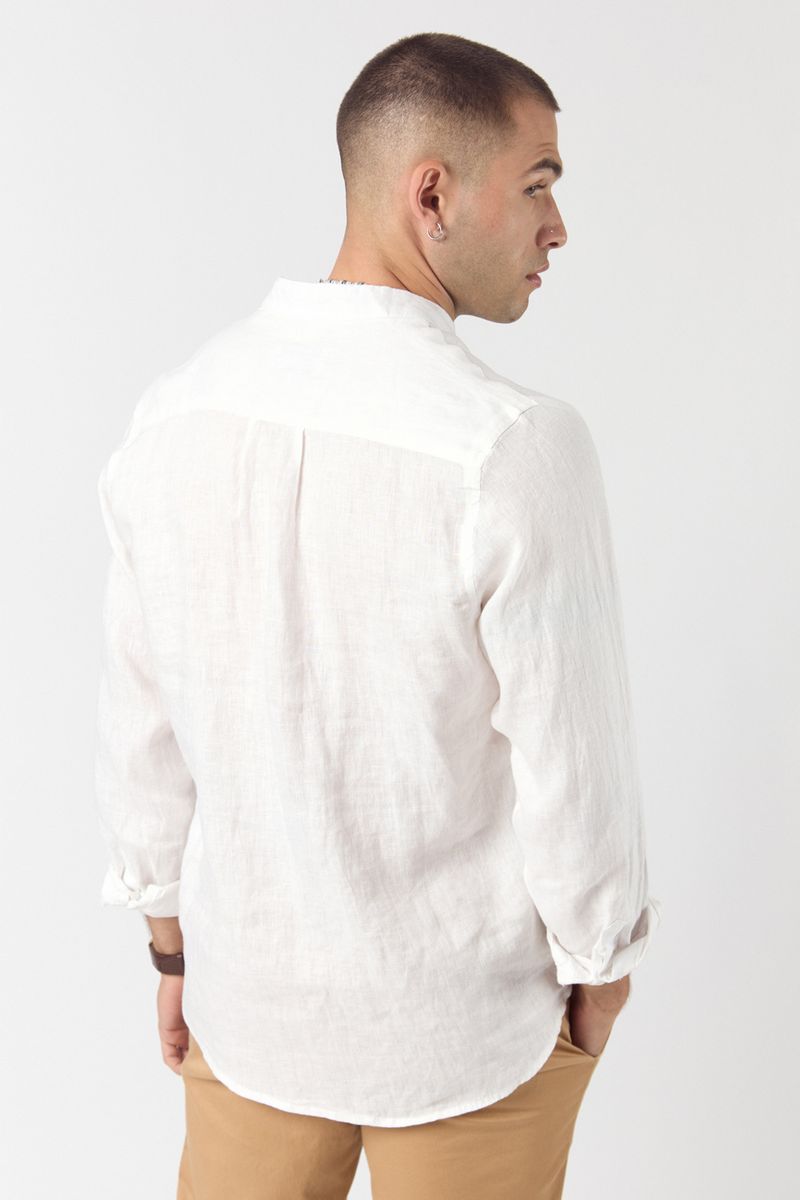 Camisa de calce regular confeccionada en 100% lino, una fibra natural de gran frescura, transpirabilidad y ligereza, ideal para climas cálidos. Presenta cuello mao, que aporta un estilo moderno y minimalista, y una tabla central en la espalda que otorga mayor amplitud y comodidad en el uso.