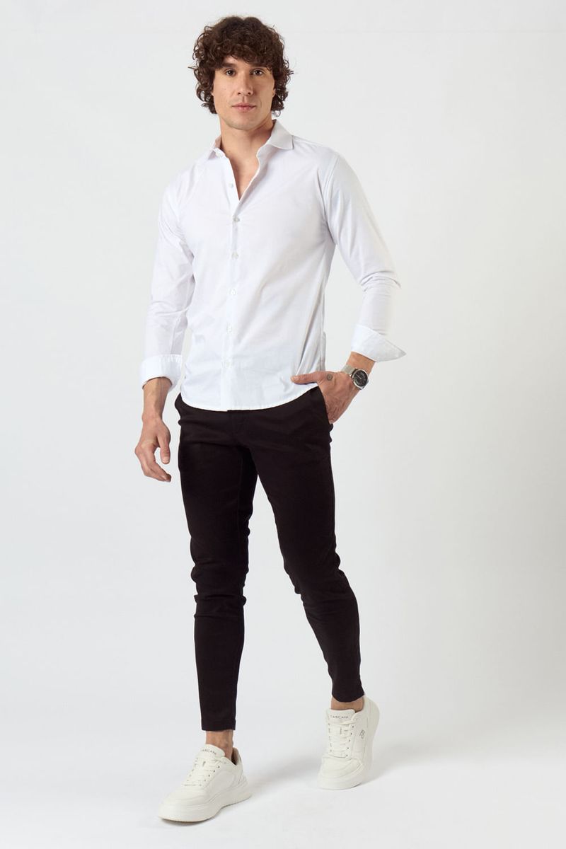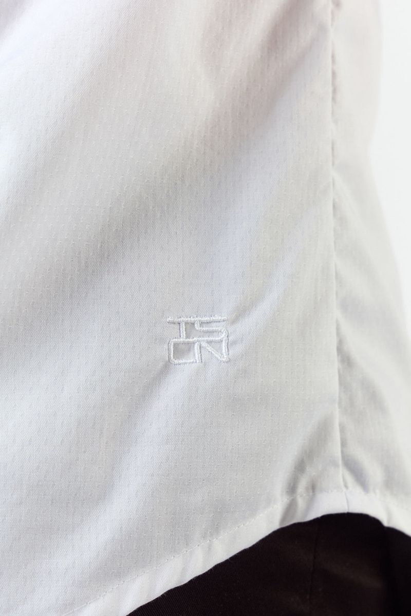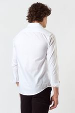 Camisa slim fit blanca confeccionada en RATIER de 100% algodon. Cuello italiano con ballena y puño terminado con forma cuadrada. Comunicación de marca con logo bordado a tono en lateral trasero derecho.