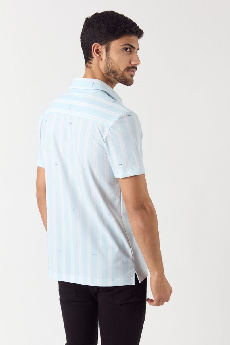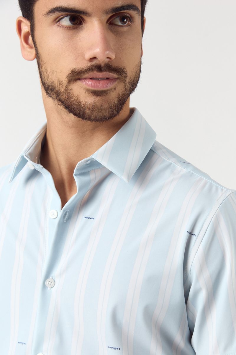 Camisa de calce regular confeccionada en lycra de seda estampada a rayas celeste. Cuello clásico y detalle de tajos en los laterales.