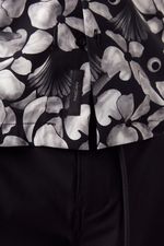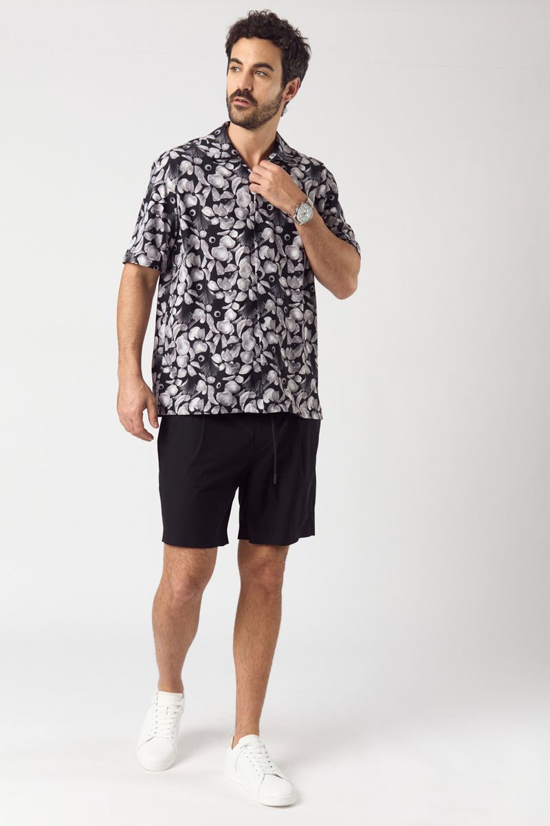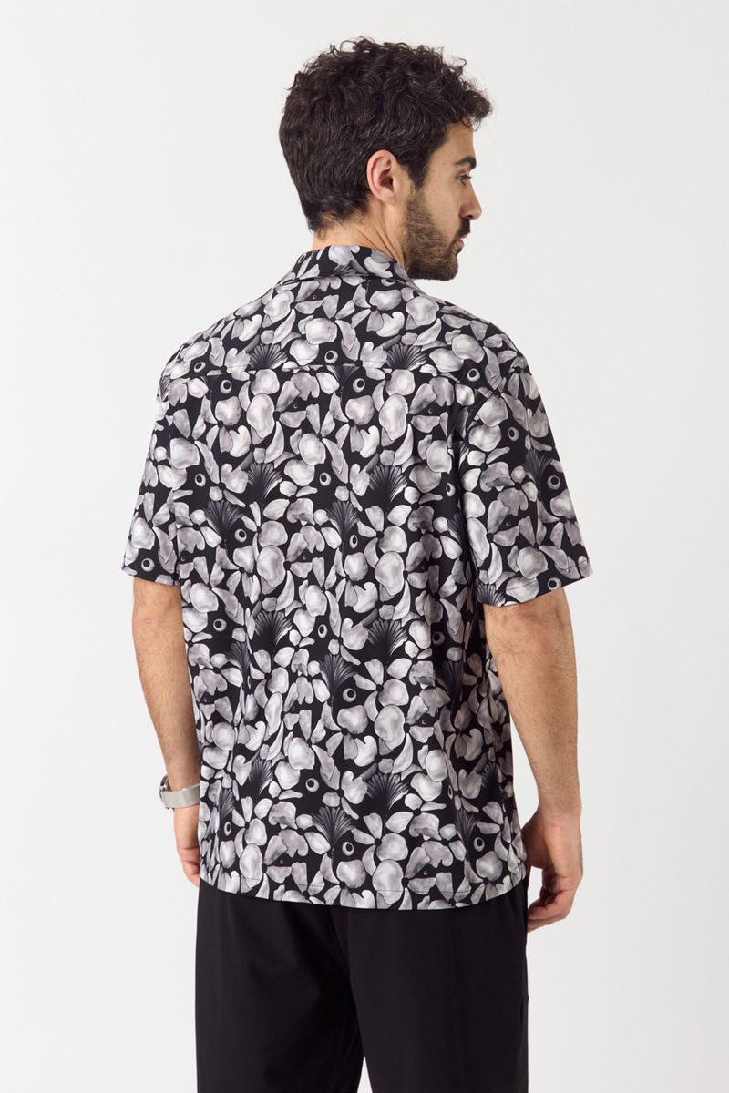 La Oslo negra es una camisa de calce relaxed fit, confeccionada en lycra de seda estampada que combina suavidad y estructura. Su diseño presenta un cuello bowling clásico y detalle de tajos laterales que aportan fluidez al movimiento, y una estética abstracta en blanco, negro y gris que la convierte en protagonista de cualquier look.