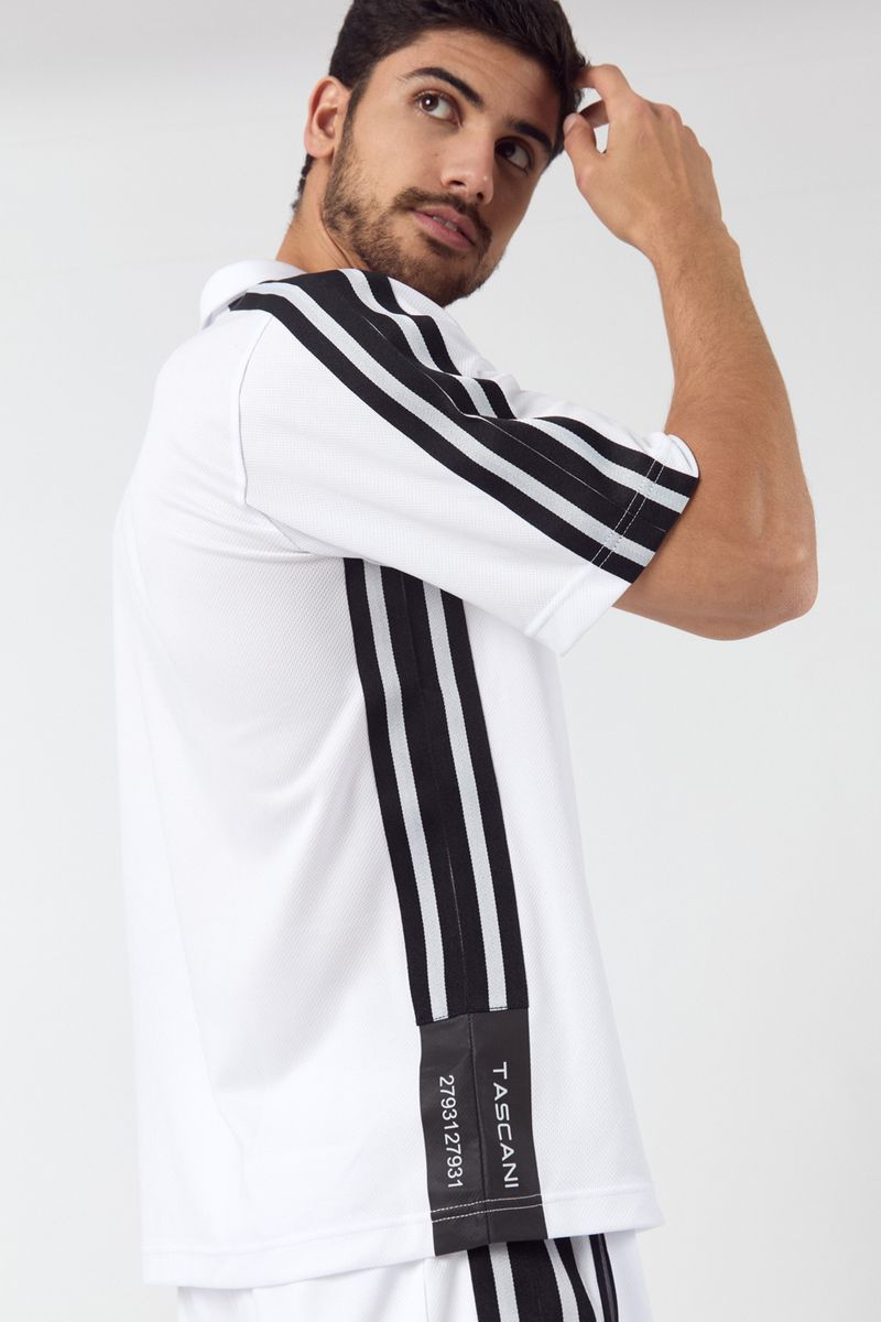 • Tiras rayadas en blanco y negro en hombros y mangas: contraste visual con impronta deportiva
