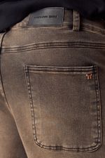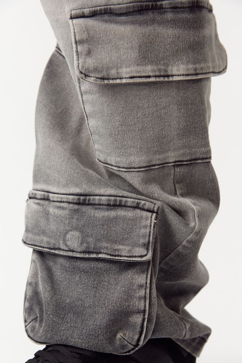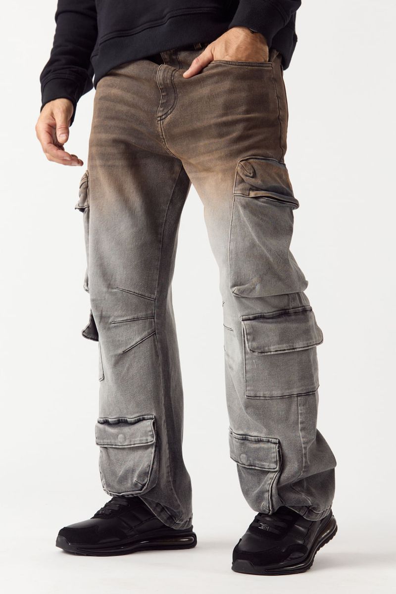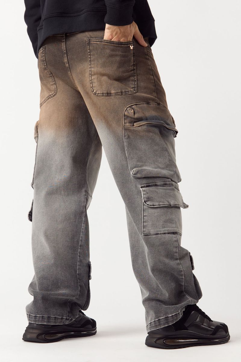 Este jean cargo destaca por su efecto degradado, pasando de un tono marrón en la parte superior a un gris más oscuro en la parte inferior, creando un look moderno y atrevido. Sus múltiples bolsillos, incluidos los grandes bolsillos cargo en los muslos y piernas, aportan funcionalidad sin perder ese toque urbano.
