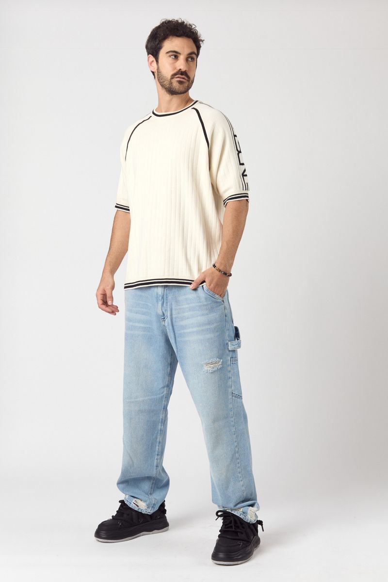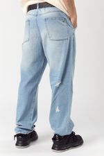 Este jean wide leg en tono celeste ofrece un calce holgado desde la cadera, brindando comodidad y un look urbano. Su diseño carpintero incluye bolsillos a su estilo, pequeñas roturas y un lavado localizado con marcas de bigotes láser, aportando un toque auténtico y sofisticado.