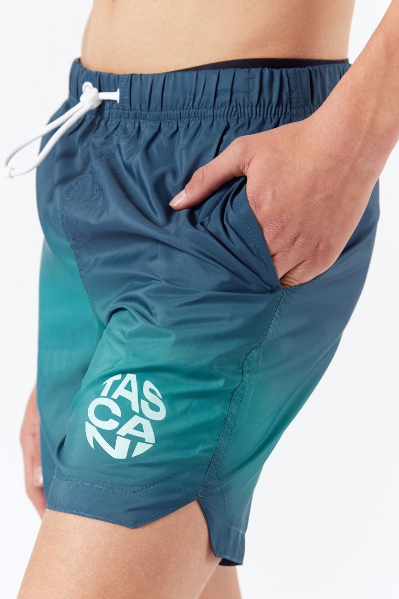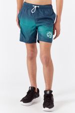 Short de baño combinacion azul y verde. Calce long fit con bolsillo trasero y apertura diagonal en ambos laterales. Cordón, tancas y ojalillos en blanco. Estampa de logo color aqua en pierna izquierda. Articulo PREMIUM fabricado con materia prima importada de estructura, calidad y suavidad única al tacto. Composición: 100% polyester