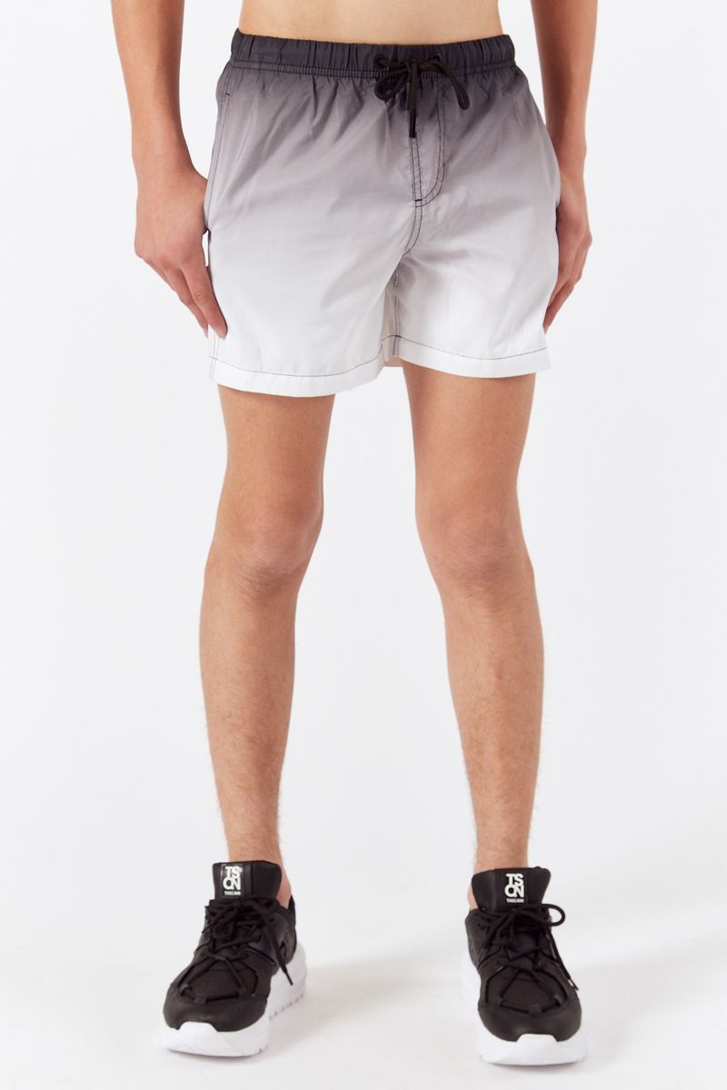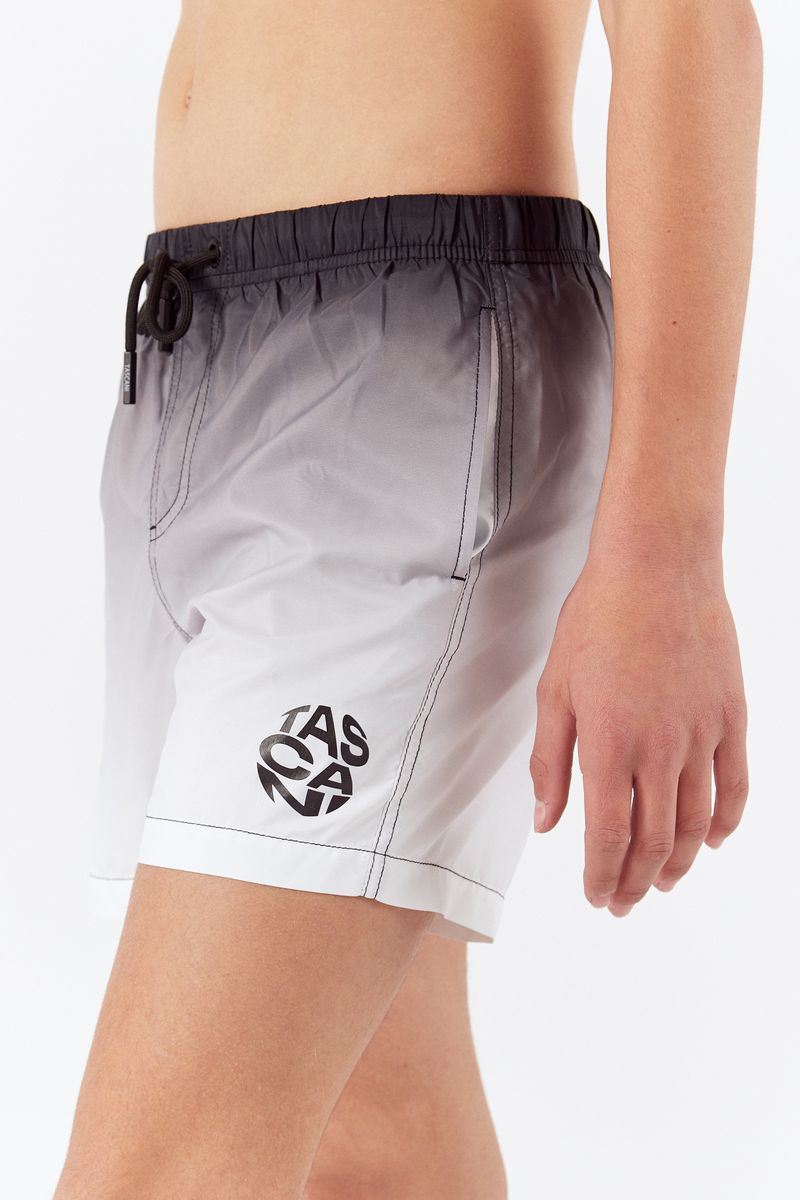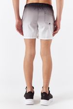 Short de baño degrade negro a blanco. Calce traditional a media pierna con detalle de bolsillo trasero. Cordón, punteras redondeadas y ojalillos en negro. Estampa de logo color negro en pierna izquierda. Articulo PREMIUM, se caracteriza por estar fabricado con materia prima importada, con una estructura, suavidad y calidad única al tacto.